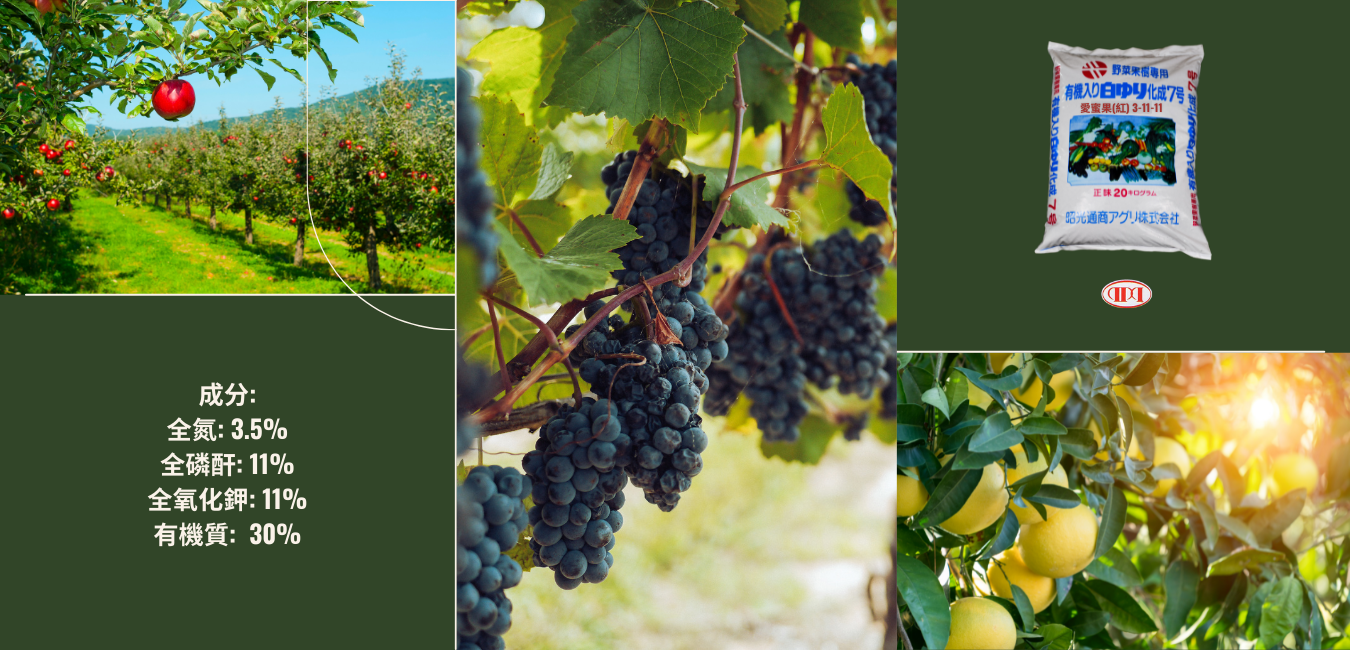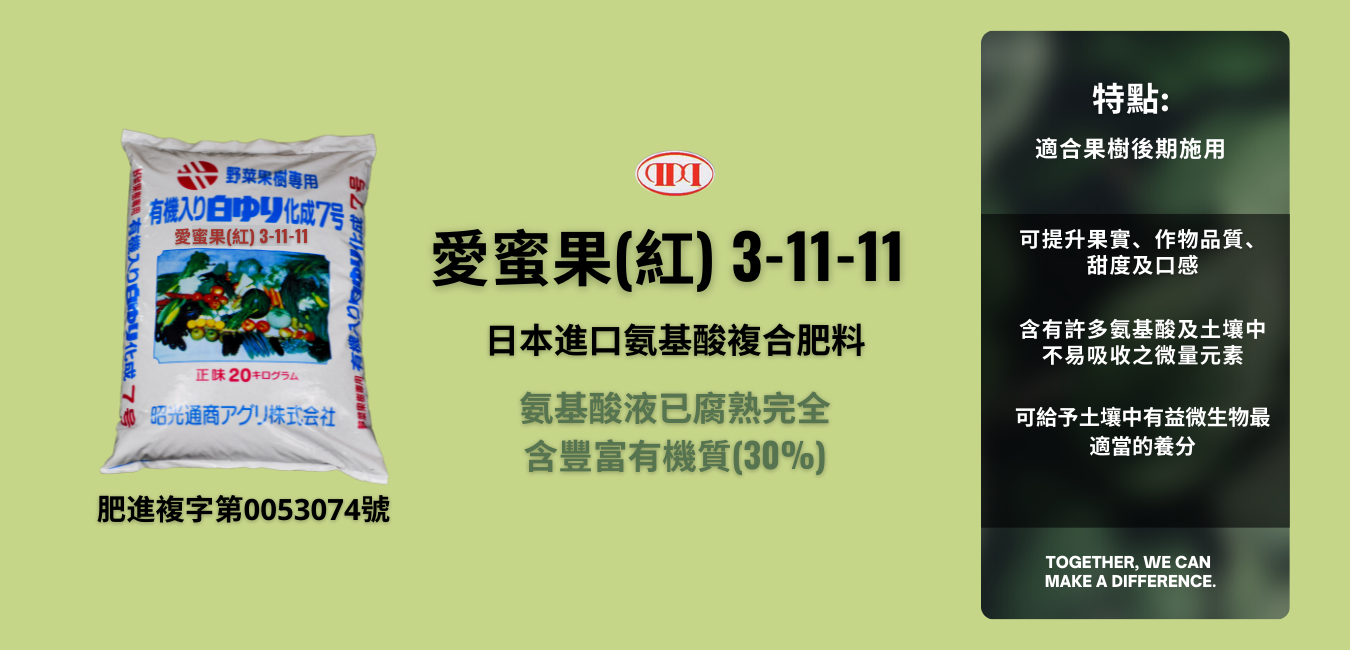 商品成份:全氮(3.5%)、銨態氮(2.5%)、全磷酐(11%)、全氧化鉀(11%)、有機質(9.6%)