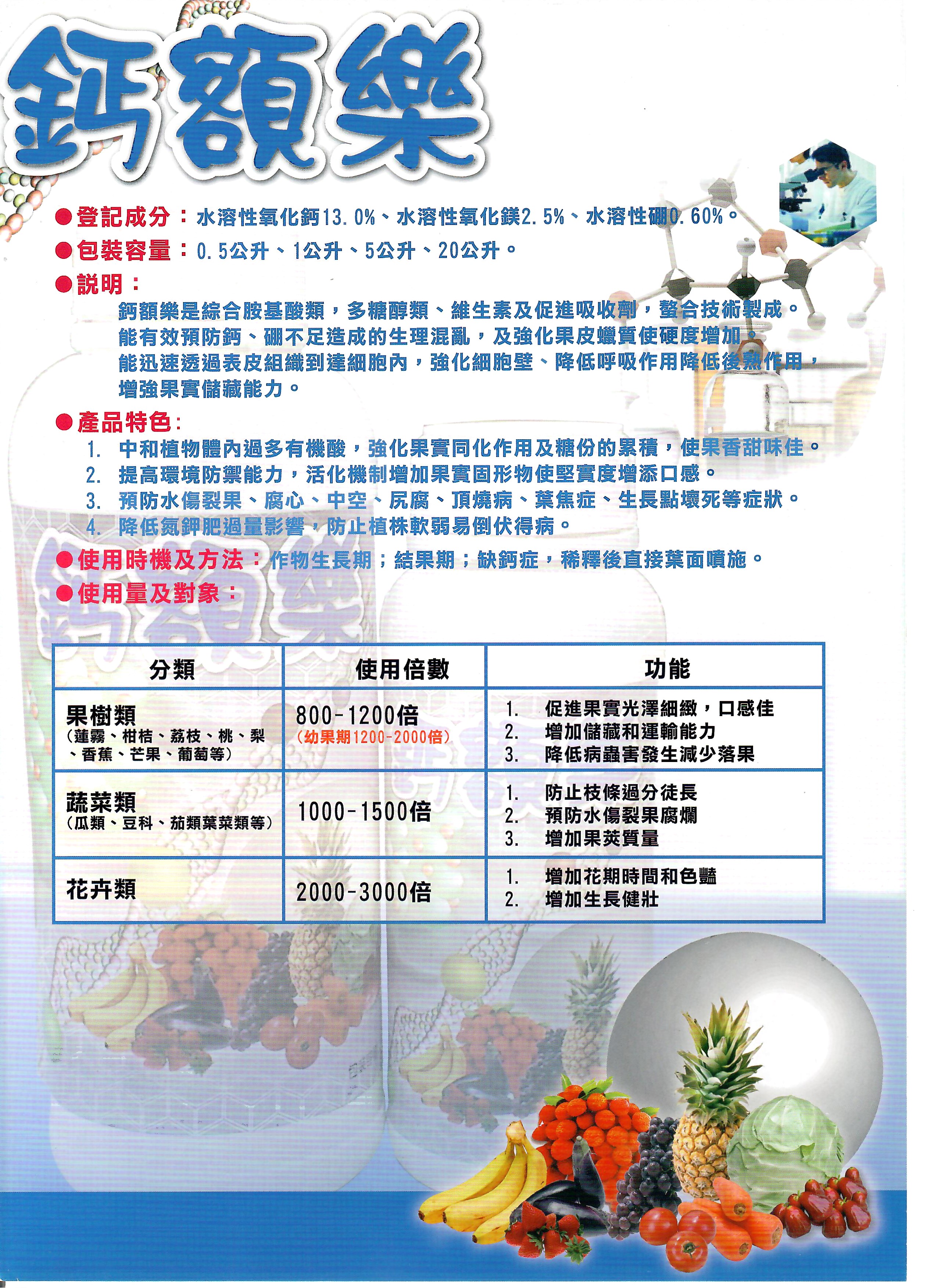 商品成份:水溶性氧化鈣(13%)、水溶性氧化鎂(2.5%)、水溶性硼(0.6%)