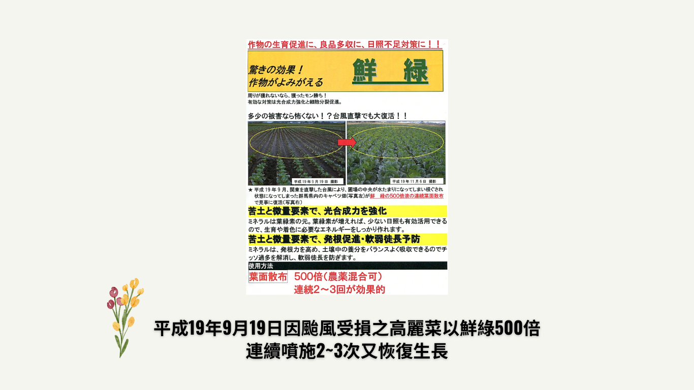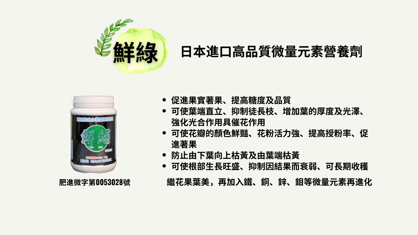 商品成份:水溶性氧化鎂(15%)、水溶性硼(0.31%)、水溶性錳(5.42%)
